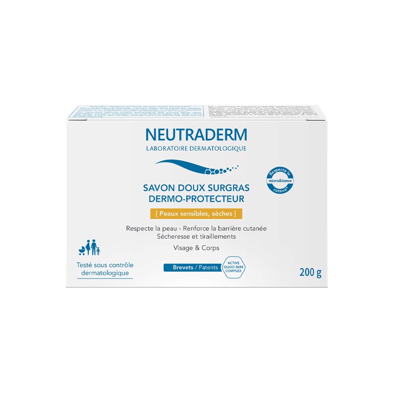 Le Savon Doux Surgras Dermo-Protecteur est un savon solide pour le visage et le corps qui apaise et nettoie la peau en douceur sans l’agresser tout en renforçant la barrière cutanée.